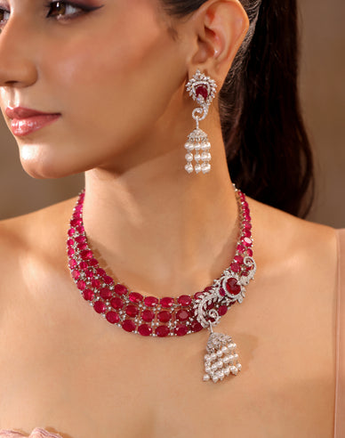 The Rosetta Set captures timeless elegance in shades of crimson and pearl. Featuring oval-cut red crystals bordered with shimmering cubic zirconia, the necklace flows into delicate pearl tassels that add graceful movement. The matching drop earrings mirror the same intricate detailing, making this set a perfect blend of richness and refinement.
