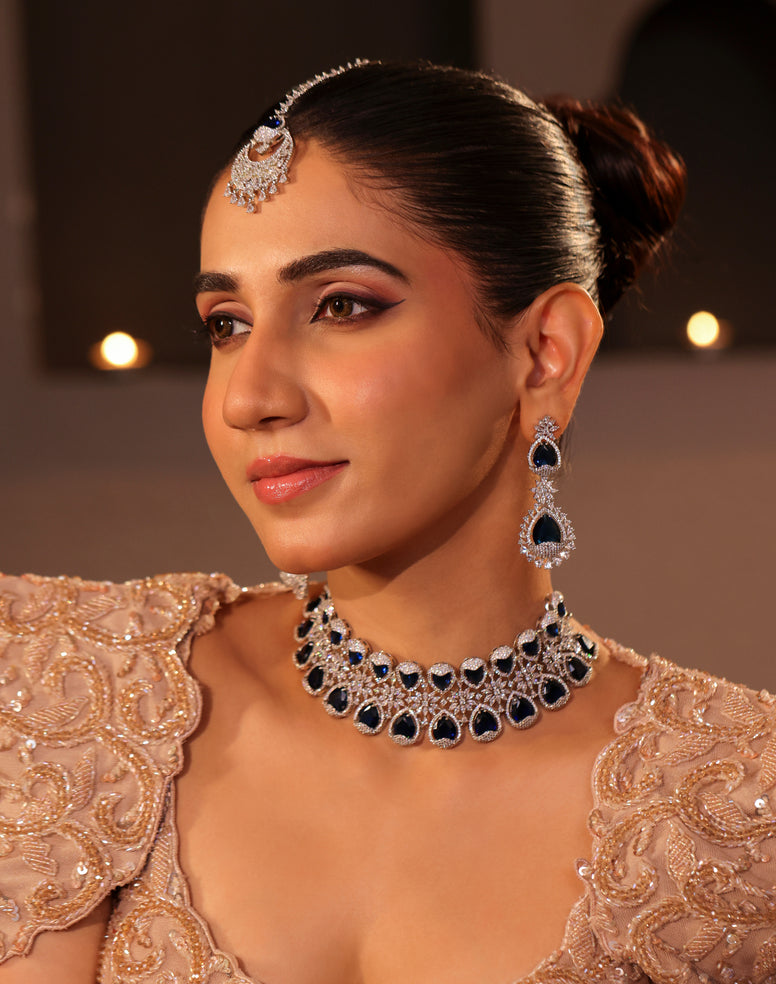 The Sapphire Regal Set is a statement bridal ensemble featuring a necklace, matching earrings, and a coordinating maang tikka. Crafted with pear-cut deep blue crystals framed in micro-set cubic zirconia, the design exudes royal elegance. Intricate floral latticework enhances its brilliance, while the maang tikka adds a traditional finishing touch — perfect for weddings, receptions, and festive occasions.