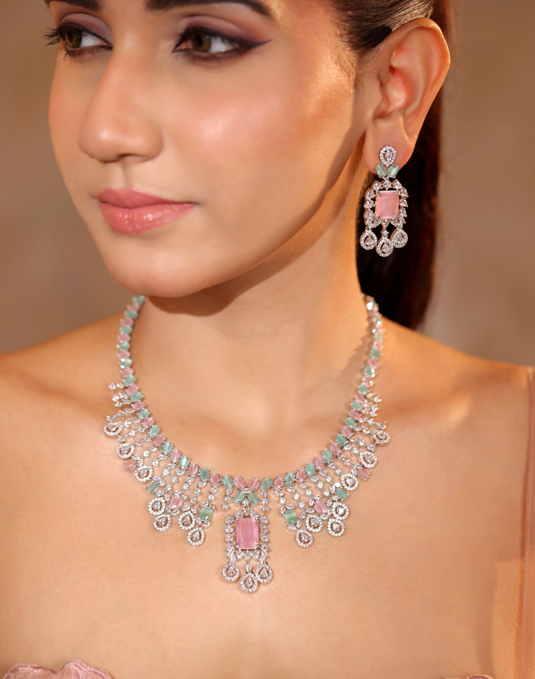 The pastel rendition of Gemior’s Regalia Set redefines bridal luxury with its delicate colour play. Alternating soft pink and mint-green stones, framed with cubic zirconia brilliance, surround a bold emerald-cut centrepiece. Finished with cascading drops and long statement earrings, this set blends romantic pastels with timeless grandeur.